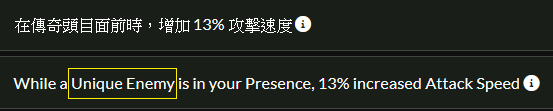 實際是 “在傳奇敵人面前時 (While a Unique Enemy is in your Presence)”。