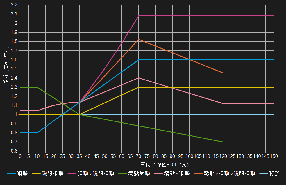 「零點射擊」也可透過和「狙擊」(或「狙擊(銳眼)」)相乘,抵銷彼此的傷害懲罰,使傷害曲線更平滑。
