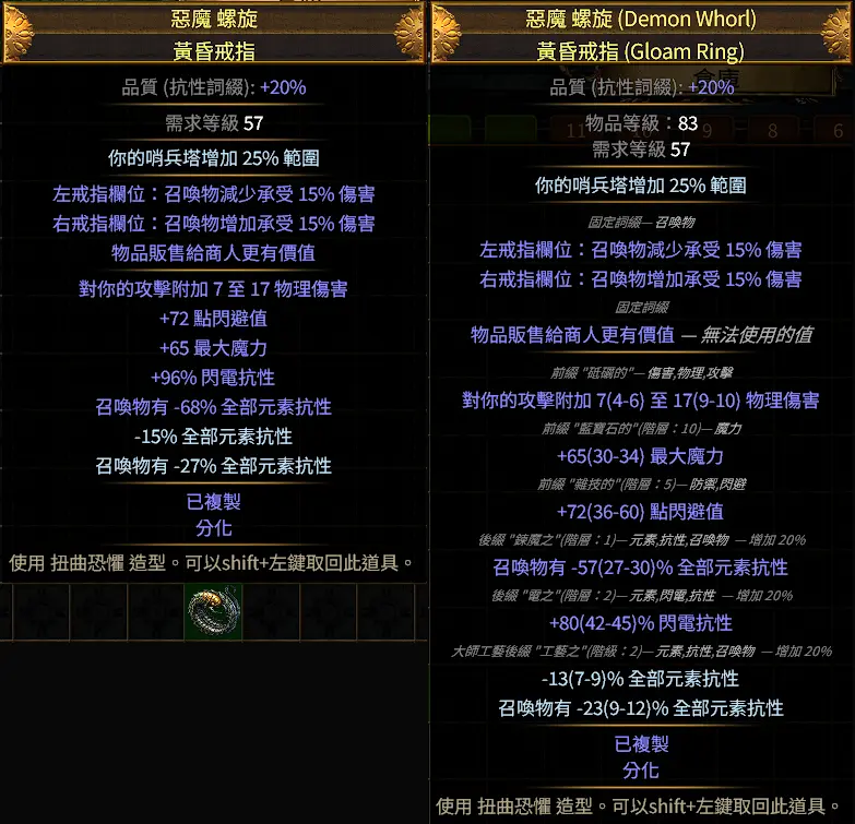 (2026/1/2 − 3.27重組器測試,未能成功轉移 “召喚物30%元抗” 詞綴到其它戒指,有可能已失效)