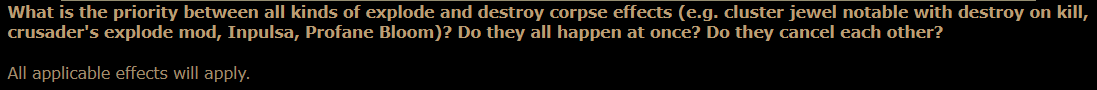 What is the priority between all kinds of explode and destroy corpse effects (e.g. cluster jewel notable with destroy on kill, crusader’s explode mod, Inpulsa, Profane Bloom)? Do they all happen at once? Do they cancel each other?